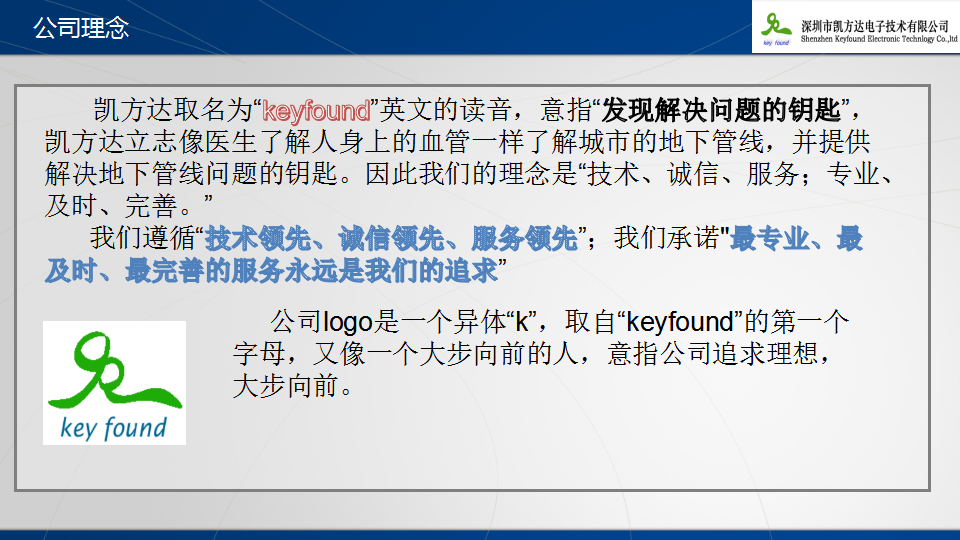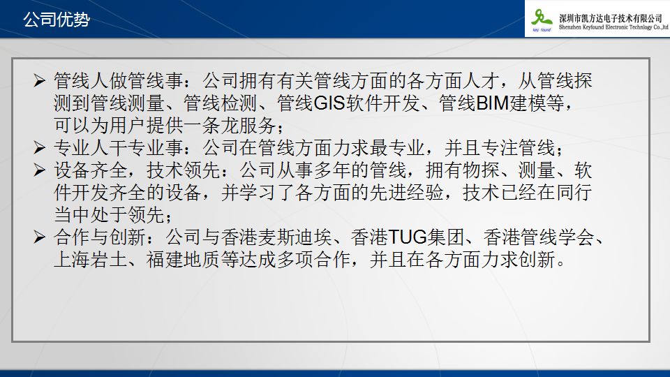 深圳市凯方达勘测技术有限公司曾名深圳市凯方达电子技术有限公司,成立于一九九八年的春天!从成立之日起,凯方达公司立志成为中国最专业的管线资料管理、管线数据采集公司,在经历了多年的成长期后,今天的凯方达勘测技术有限公司已是一家集GIS软件开发、地下管线数据采集、地下管线检测、地下管线数据建模,勘察测绘于一体的高科技公司。并且已成为国家级的高新企业,获得了软件企业认证,获得了测绘乙级资质。公司拥有一批在软件开发、地球物理、测量等领域卓有建树的精英人才。其中本科以上学历占公司技术人员比例达到70%以上,他们是一支极具开拓进取、团结奋斗精神的团队,公司自成立以来,在GIS软件开发、工程物探、工程测量等方面取得了丰硕的成果。